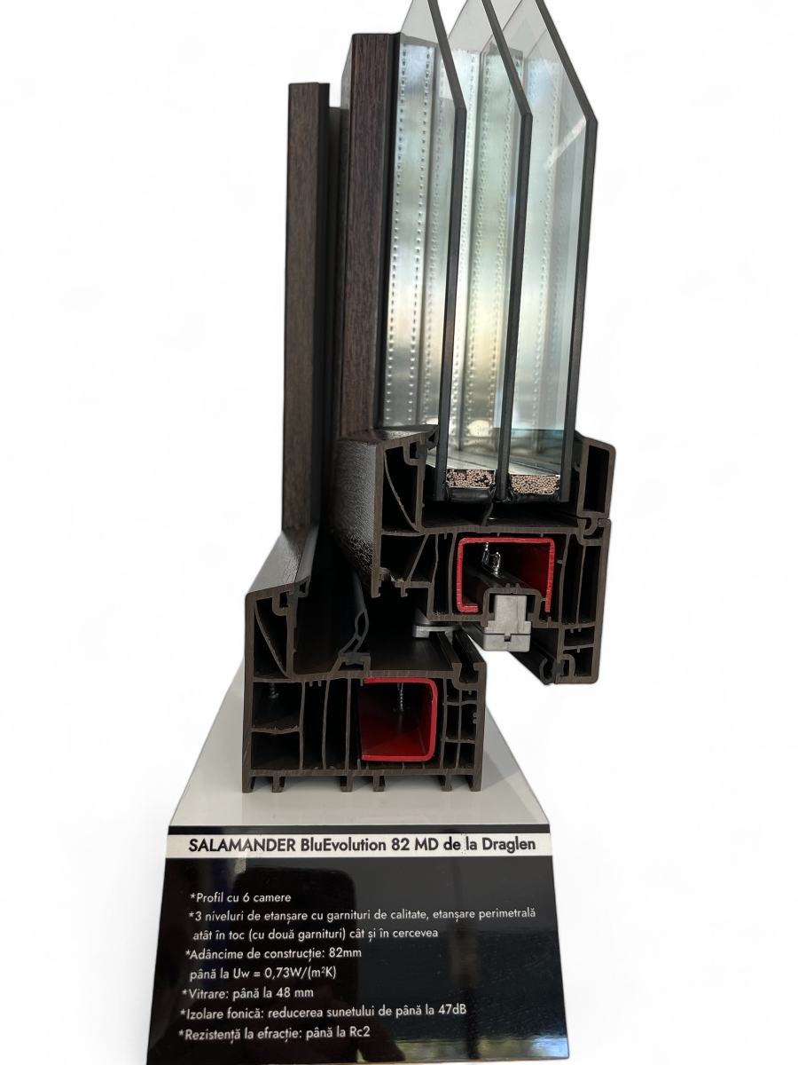 Cu o garnitură mediana și o adancime constructiva de 82 mm, acest sistem de profile PVC este proiectat să asigure o etanșeitate superioară, contribuind astfel la reducerea pierderilor de căldură și la îmbunătățirea eficienței energetice a locuințelor.